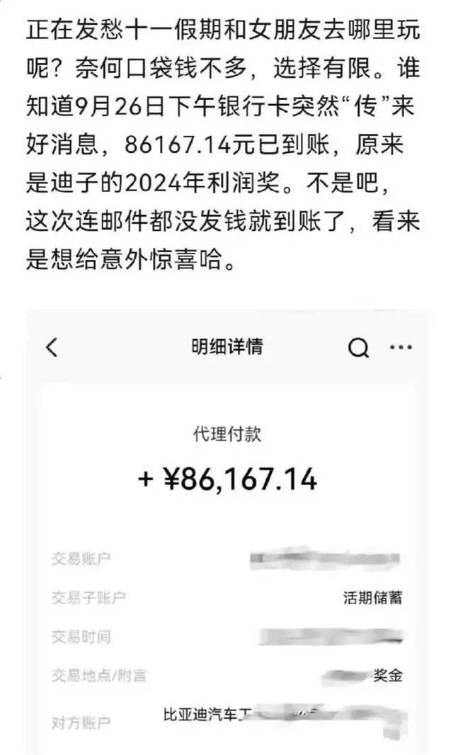近期,陆续有比亚迪员工在社交平台上发消息称,他们在毫无预兆的情况下,突然收到了公司发放的一笔“利润奖”。
