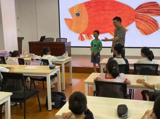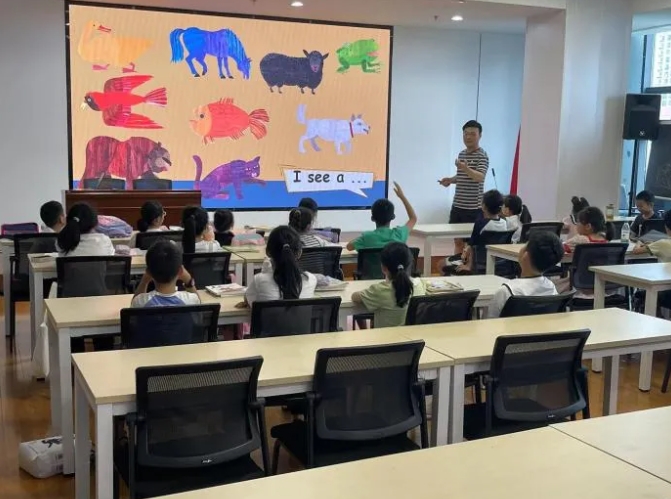 英语课上,一首欢快的英文儿歌瞬间点燃了孩子们的学习热情。英语老师将色彩斑斓的图片与萌态可掬的动物形象结合在一起,将抽象的英语单词变得生动有趣,激发了孩子们学习英语的兴趣。