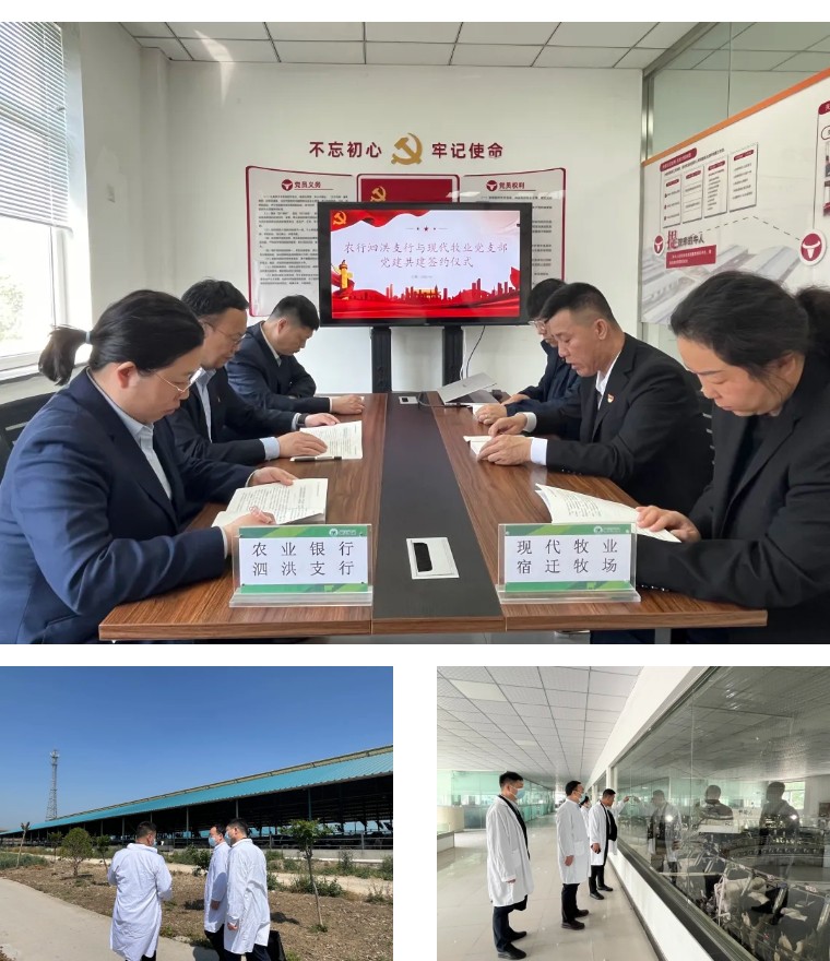 活动伊始,双方举行共建签约仪式,组织党员专题学习贯彻中央八项规定及其实施细则精神,结合银行业合规管理要求与畜牧业产业特点,选取行业典型案例开展警示教育,引导党员干部筑牢思想防线、强化责任担当。理论学习环节后,企业党支部负责人带领银行党员实地走访奶牛养殖棚、智能化挤奶大厅,详细介绍国内奶牛养殖技术迭代升级成果、牧场规模化养殖现状及资金需求情况。农行泗洪县支行党员业务骨干现场调研对接,结合企业经营实际,现场提出定制化综合金融服务方案,双方就深化业务合作达成共识。