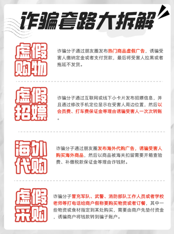 诈骗分子在微信群、朋友圈、网购平台或其他网站发布低价打折、海外代购、0元购物等虚假广告,以及提供代写论文、私家侦探、跟踪定位等特殊服务的广告。在与受害人取得联系后,诈骗分子便诱导其通过微信、QQ或其他社交软件添加好友进行商议,进而以私下交易可节约手续费或更方便为由,要求私下转账。受害人付款后,诈骗分子再以缴纳关税、定金、交易税、手续费等为由,诱骗其继续转账汇款,最后将其拉黑。