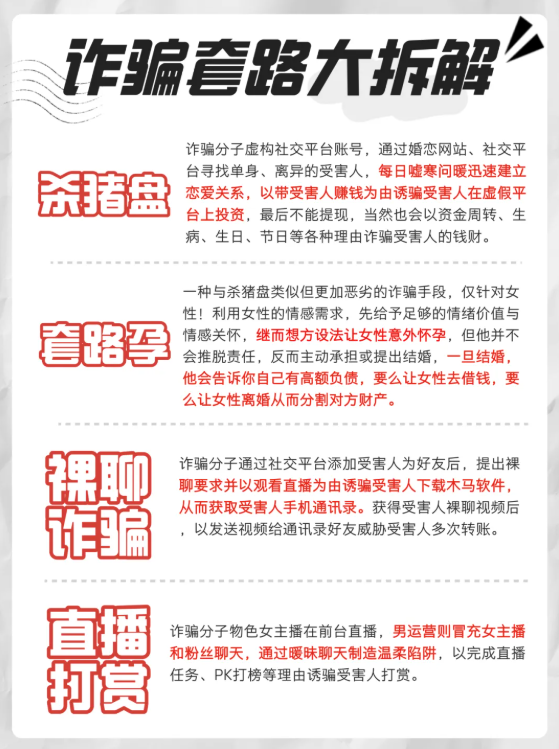 诈骗分子通过在婚恋、交友网站上打造优秀人设,与受害人建立联系,用照片和预先设计好的虚假身份骗取受害人信任,长期经营与其建立的恋爱关系,随后以遭遇变故急需用钱、项目资金周转困难等为由向受害人索要钱财,并根据其财力情况不断变换理由提出转账要求,直至受害人发觉被骗。