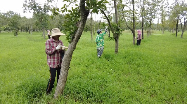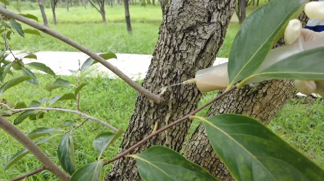 我们用两种药阿维菌素和菊脂来专门治理虫害,(用注射器)注射到虫洞里,主要治理天牛等甲壳类病虫害。