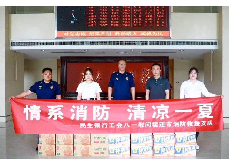 为弘扬拥军优属光荣传统,营造尊崇军人职业、尊重退役军人的浓厚氛围。8月1日,民生银行宿迁分行开展“情系消防 清凉一夏”慰问活动,向坚守一线的消防员送去殷切关怀和诚挚问候。