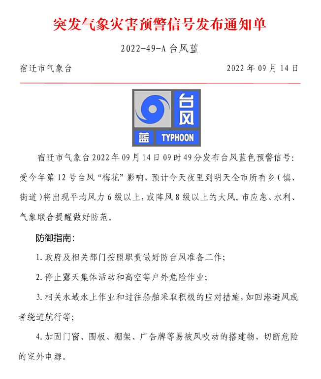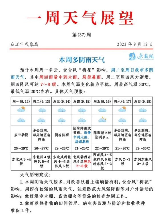 受第12号台风“梅花”影响,宿迁将有明显风雨天气。主要影响时段在13日至16日,宿迁将有大到暴雨,局部大暴雨。