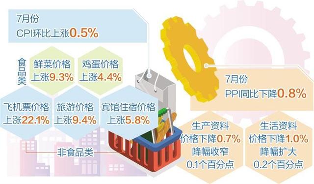 从环比看,CPI由上月下降0.2%转为上涨0.5%。食品中,受部分地区高温降雨天气影响,鲜菜和鸡蛋价格分别上涨9.3%和4.4%;非食品中,暑期出游需求较旺,飞机票、旅游和宾馆住宿价格分别上涨22.1%、9.4%和5.8%,涨幅均高于近10年同期平均水平。