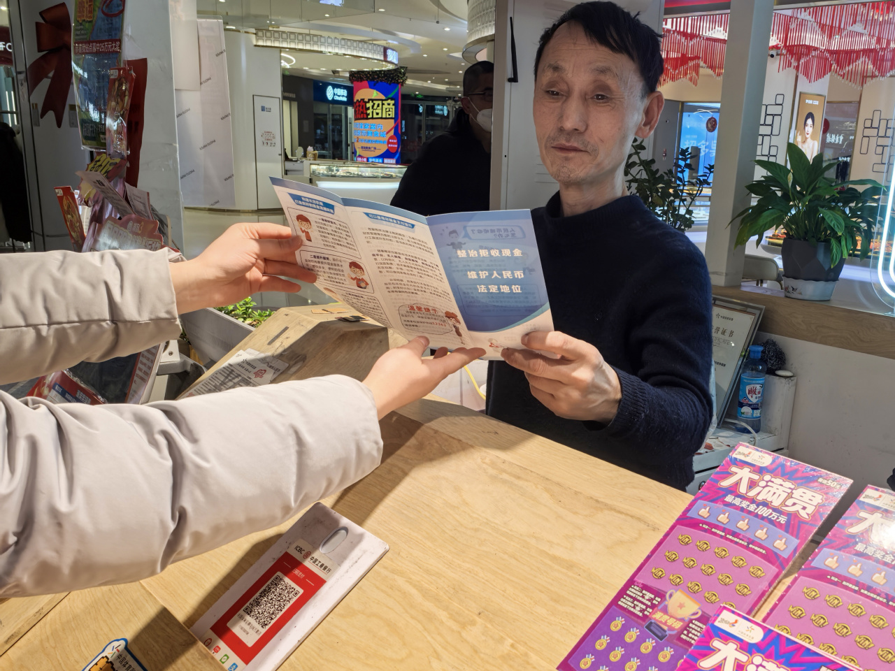 交通银行宿迁洋河支行员工深入周边社区大型商超、小型生活商店、学校等地,通过实地走访,向收银员、单位财务科、小卖部窗口人员等进行“一对一”、“零距离”现场宣讲。向他们详细介绍人民币的法定地位,强调人民币作为国家信用的象征,代表了国家形象,任何单位和个人都不得拒收人民币现金。