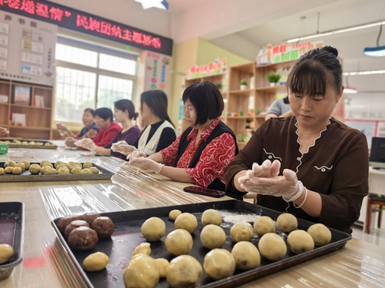 作为活动核心,“共制团圆饼 共话家国情”环节温情满溢。志愿者提前备好月饼皮、五仁、莲蓉等食材,专业烘焙师现场指导。各族群众围站在操作台前一边揉面、包馅、压模,一边你一言我一语说起各自家乡的中秋习俗、祖国的变化,从“嫦娥奔月”的传说聊到如今的航天成就,从家乡的老月饼制作聊到现如今过节的新变化,话语里满是对家国的热爱,活动室里满溢月饼的甜香以及团结的“馨香”。