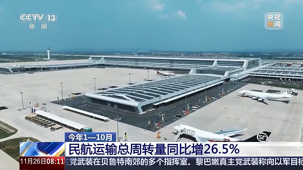 今年1—10月,民航全行业共完成运输总周转量1238.3亿吨公里,同比增长26.5%;完成旅客运输量6.2亿人次,同比增长18.6%;完成货邮运输量729.8万吨,同比增长23.9%。运输总周转量、旅客运输量以及货邮运输量三大指标较2019年同期均实现两位数增长,特别是国际航线货邮运输量大幅增长48.5%。