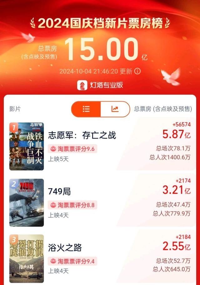 据网络平台数据显示,截至10月4日21时46分,2024年国庆档新片票房(含点映及预售)突破15亿!《志愿军:存亡之战》《749局》《浴火之路》暂列新片票房前三名。