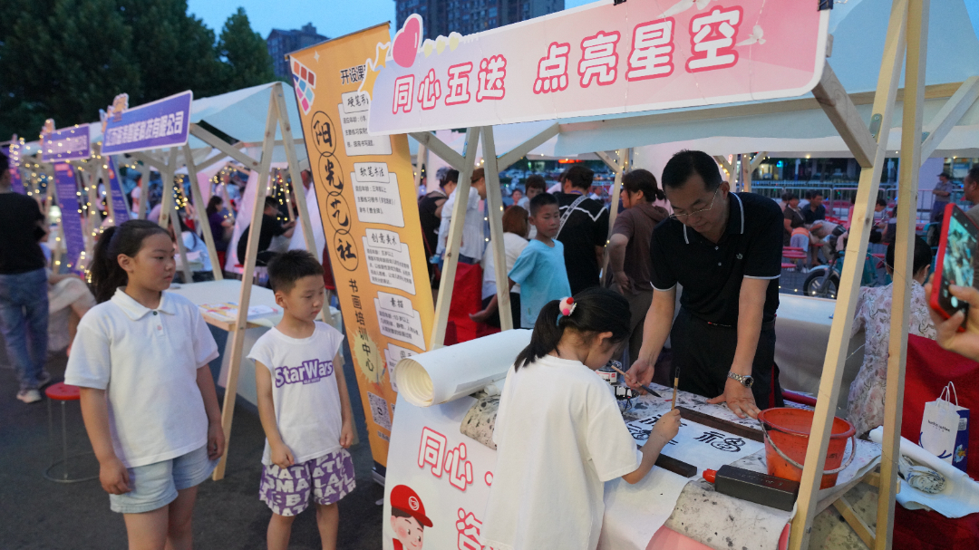 暑假来临,为了帮助孩子提高书法能力,民进会员金泽中老师现场开设书法小课堂,他细心讲解书写毛笔字的正确方法,激发孩子们学习书法的热情。市民陈女士高兴地介绍,“孩子蛮喜欢的,也蛮感兴趣的,碰巧今天晚上带她出来,让他体验一下。”
