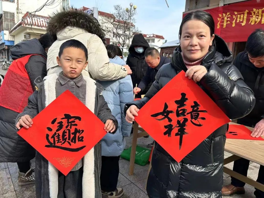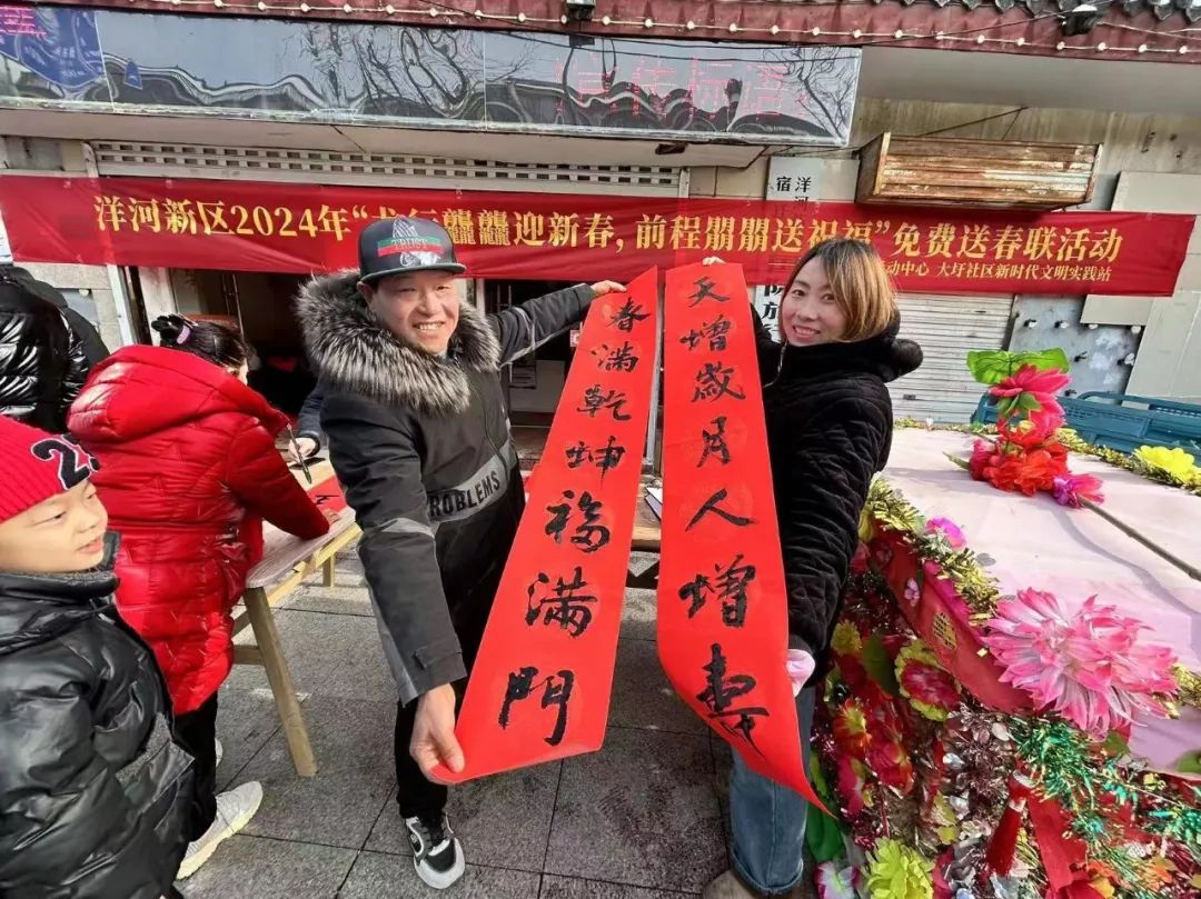 为进一步弘扬中华优秀传统文化,营造浓厚的节日氛围,2月6日下午,大圩社区新时代文明实践站联合洋河镇文化活动中心共同举办“龙行龘龘迎新奏,前程朤朤送祝福”免费送春联活动,组织退休教师、书法教师和部分小学生共同参加,让辖区居民在家门口欢欢喜喜过新年。