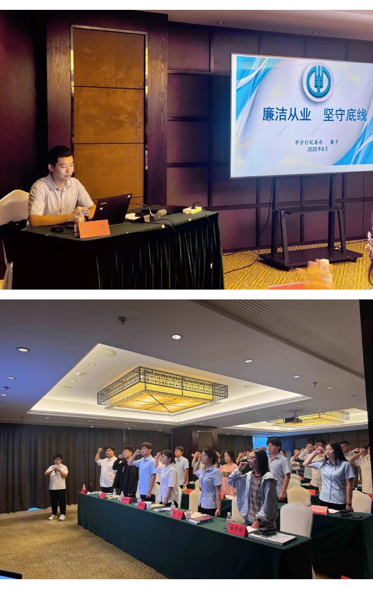 一堂廉洁课堂,扣严“纪律扣”。该行以“廉洁从业 坚守底线”为主题,面向新入行员工开展廉洁警示教育,结合“身边人、身边案”上了一堂生动的廉政课,教育引导新入行员工自省自律自爱,切实增强纪律意识,严守纪法底线。课上,新入行员工右手举拳,庄严宣誓,用铿锵誓言许下廉洁承诺,以纪律自觉筑牢职业根基。