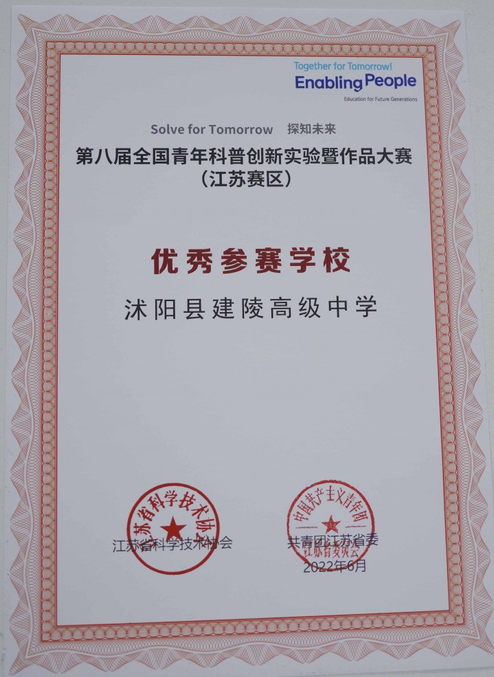 沭阳县建陵高级中学被江苏省科学技术协会、共青团江苏省委联合授予“江苏省优秀参赛学校”,此项荣誉全省仅有5家。
