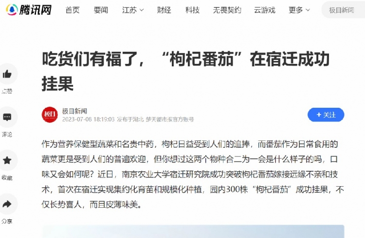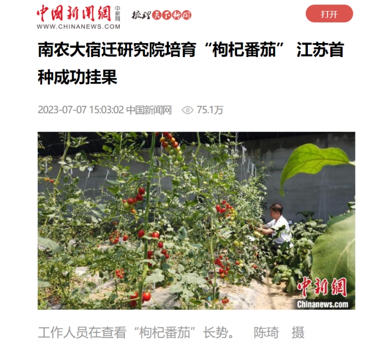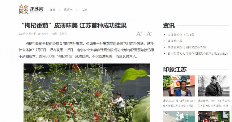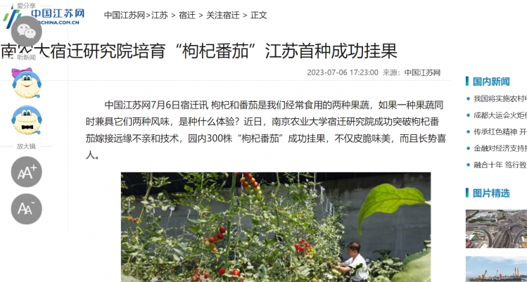 近日,南农大宿迁研究院历经两年多研究,“枸杞番茄”江苏首种成功挂果,此项成果落地后,接连被央省众多媒体关注。