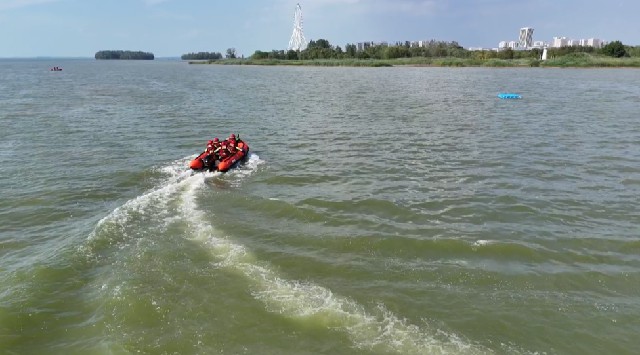 转战室外骆马湖训练场地,实战氛围更浓。湖面波光粼粼,冲锋舟开展离心力救援训练,在指挥员指令下快速转弯、调整方位,完成救援对接。翻舟自救训练同样扣人心弦:“翻舟” 指令下达后,冲锋舟瞬间倾覆,队员沉着应对,按要领从倒扣舟艇中脱离,借救生衣浮力保持平衡,随后多人协作喊着口号扶正舟艇、依次登舟,过程一气呵成。