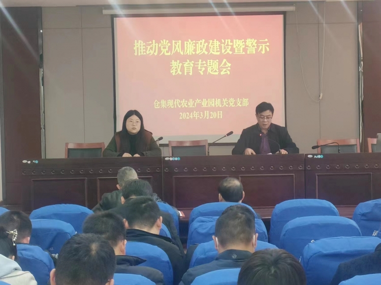会上,仓集现代农业产业园纪委书记陈生剑传达学习了习近平总书记在二十届中央纪委三次全会上的重要讲话精神,中央、省、市纪委全会公报,新区党风廉政建设和反腐败工作暨作风建设大会精神,并就开展“警示教育月”活动进行了详细部署。