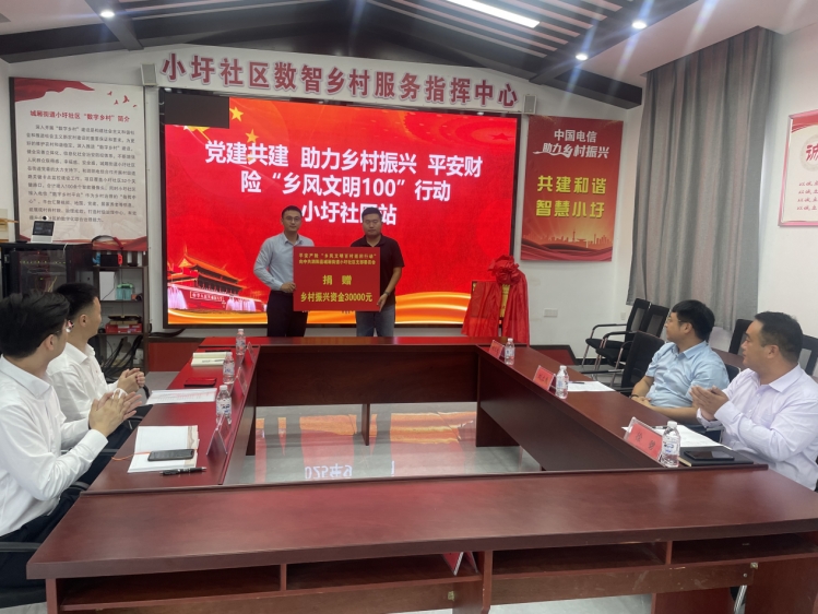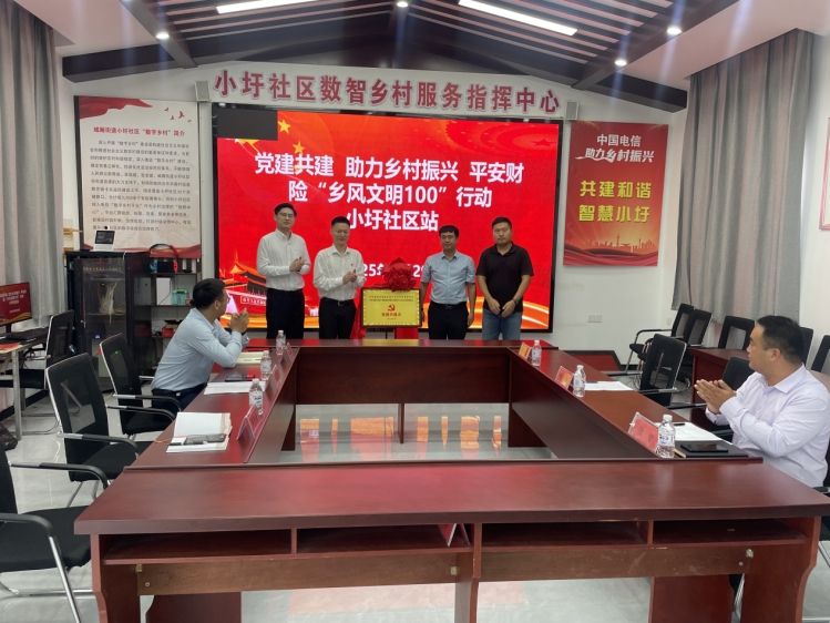 9月29日,平安产险宿迁中心支公司党支部与泗阳县城厢街道小圩社区党支部党建共建揭牌仪式暨“乡风文明100”行动小圩社区站顺利举行。泗阳县城厢街道党工委副书记刘立康,泗阳县城厢街道党工委副书记、小圩社区驻村第一书记赵大地,平安产险宿迁中心支公司党支部委员、副总经理王龙,平安产险宿迁中心支公司副总经理邢开余,平安产险江苏分公司农险部副经理肖聪等出席活动。
