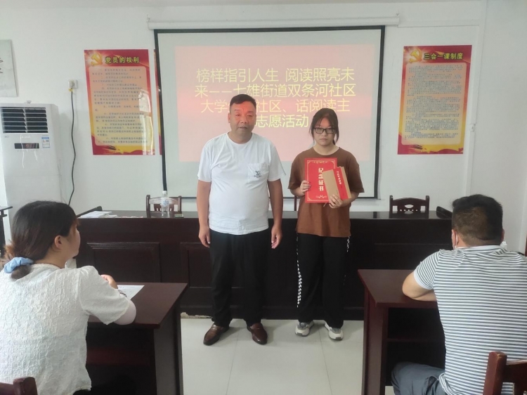 为进一步推进书香城市创建和全民阅读活动开展,满足广大农民群众基本文化需求。近日,沭阳县七雄街道双条河社区邀请准大学生以及在校大学生,开展“榜样指引人生 阅读照亮未来”——大学生进社区、话阅读主题活动。