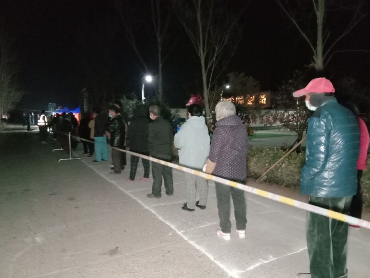 接到核酸检测通知后,很多村民早就和家人提前前往采样点等待。在黄庄村,村民们出示个人身份证、手机苏康码、行程码,大家间隔一米,有序检测。由于是下午临时通知,很多村民主动放下手头工作确保能够及时检测。