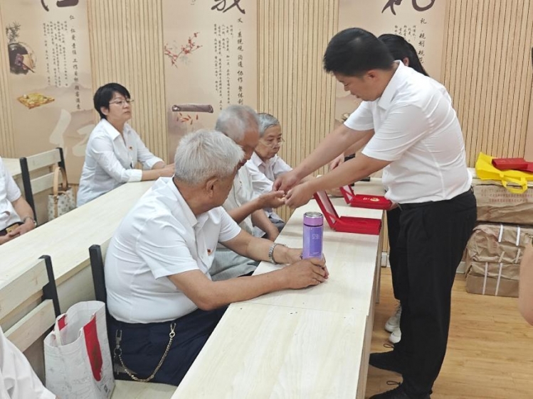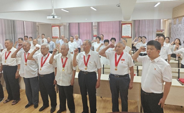 活动开始,新桥社区党委书记潘杰同志带领全体党员重温入党誓词,全体党员一同高举右拳,再次庄严宣誓:“我志愿加入中国共产党 …… 随时准备为党和人民牺牲一切,永不叛党。” 铿锵有力的声音传达出身为共产党员的自豪感和使命感。随后向“光荣在党50年”的7位老党员们颁发纪念章,引导广大党员干部牢记初心使命、传承红色基因,大家围坐在一起共同为党的生日献礼。