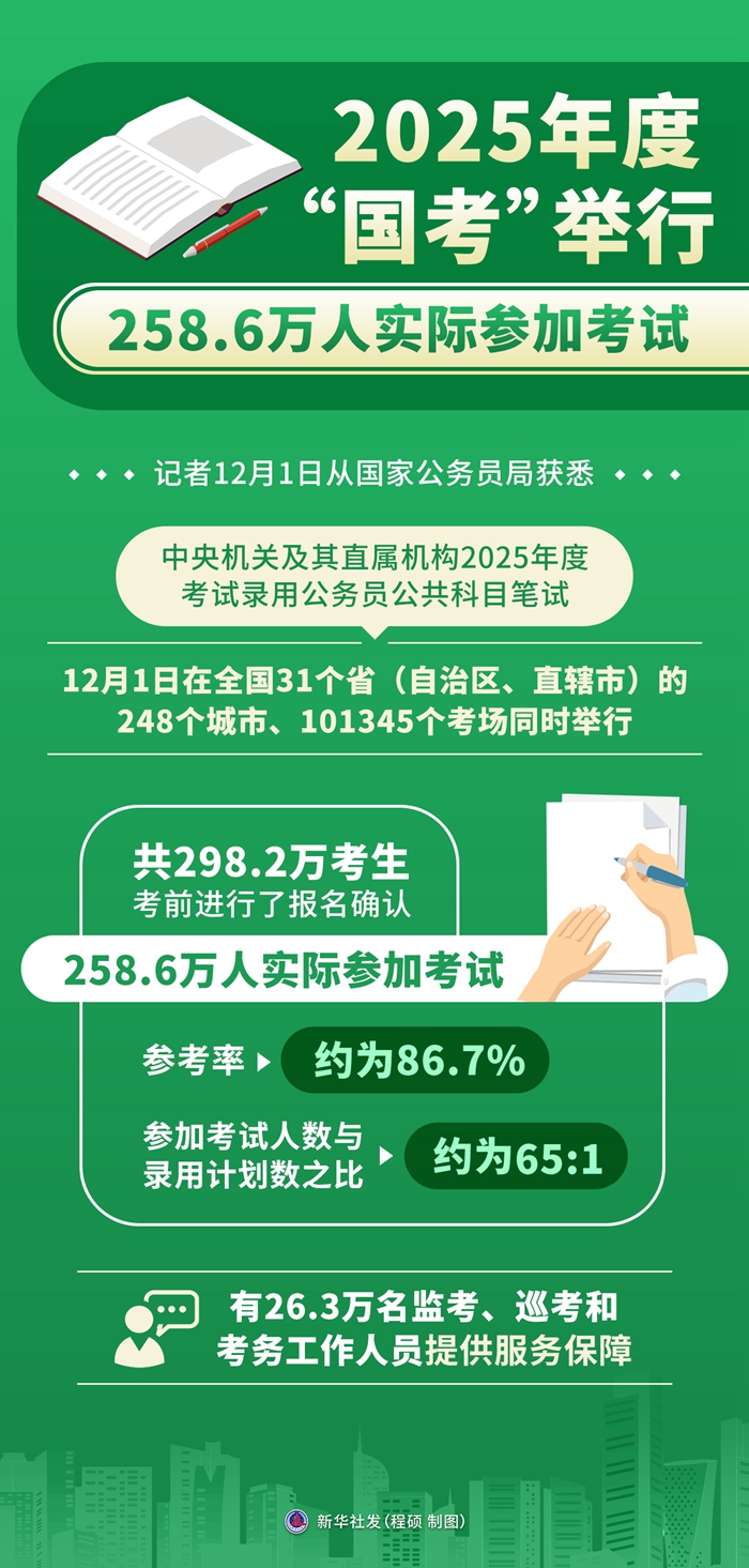 新华社北京12月1日电 记者1日从国家公务员局获悉,中央机关及其直属机构2025年度考试录用公务员公共科目笔试1日在全国31个省(自治区、直辖市)的248个城市、101345个考场同时举行,共298.2万考生考前进行了报名确认、258.6万人实际参加考试,参考率约为86.7%,参加考试人数与录用计划数之比约为65:1,有26.3万名监考、巡考和考务工作人员提供服务保障。