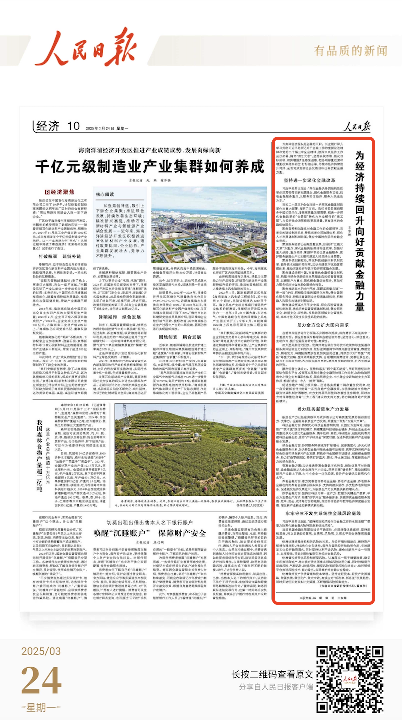 3月24日,《人民日报》刊登兴业银行党委书记、董事长吕家进署名文章,题目为《为经济持续回升向好贡献金融力量》。文章表示,兴业银行深入学习贯彻习近平总书记关于金融工作的重要论述精神和党的二十届三中全会精神,按照中央经济工作会议部署,把各项存量政策和增量政策落实到位,为推动经济持续回升向好、全面完成经济社会发展目标任务贡献金融力量。