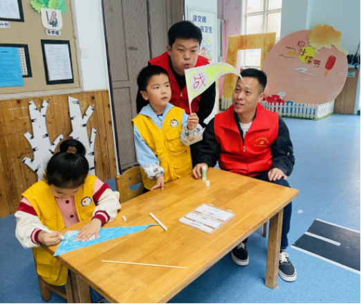 孩子们在社区志愿者的指导下,手工绘制一幅幅充满童趣和祝福的彩旗,活动现场其乐融融。