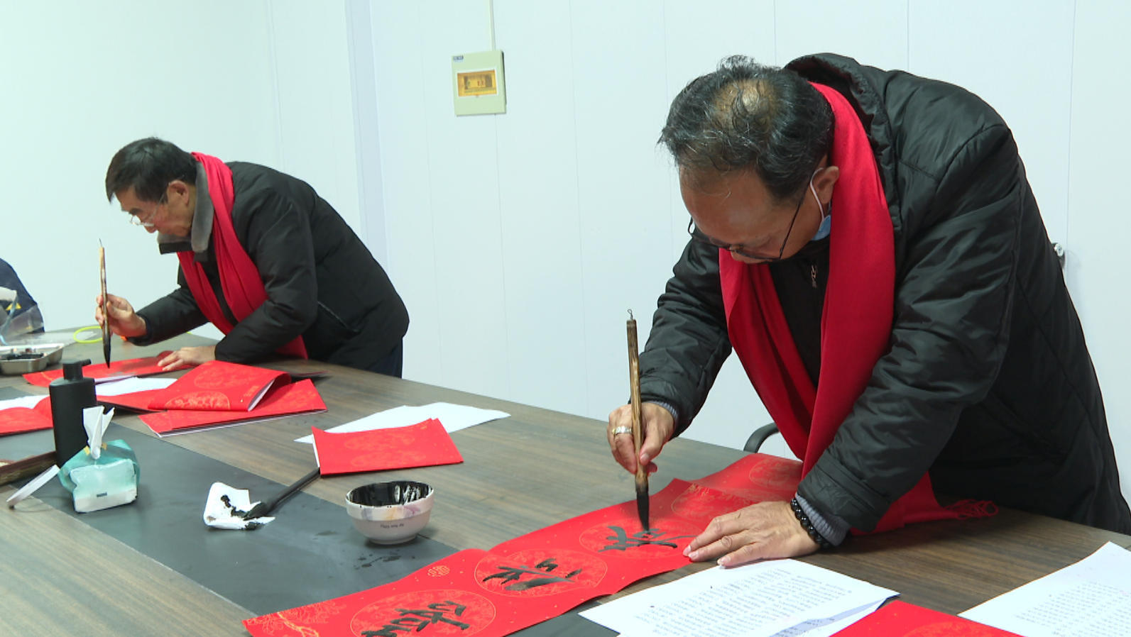 1月18日下午,泰和社区雅兰小区党群活动室内墨香盈屋,热情洋溢,其乐融融,来自宿迁市书法家协会的两名书法家挥毫泼墨,写下一幅幅满载祝福和希望的春联,书法家们笔走龙蛇,各显神韵,喜气的红纸在书法家的笔下变成了一对对的春联,新春的年味扑面而来。