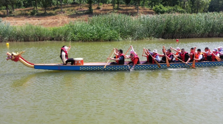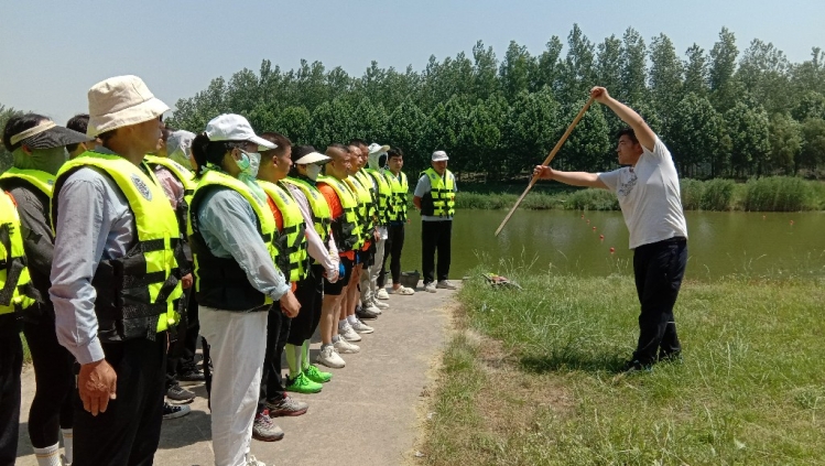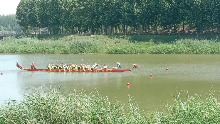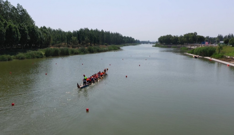 在爱情主题公园古黄河畔,龙舟教练正在对参赛队员进行划桨要领讲解,入水、拉水、御水、移桨,每一个动作都要求规范到位。队员们手握船桨,轮流比划,实训操作,迫不及待下水训练。随着鼓声响起,一时间平静宽阔的水面立刻激起千层浪,鼓声、水声、呐喊声交织在一起,让人热血沸腾。