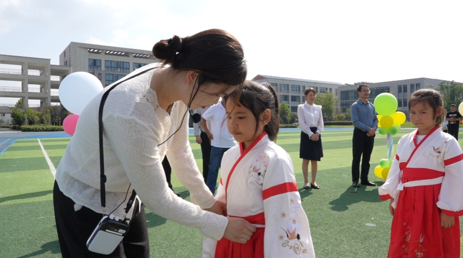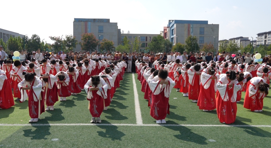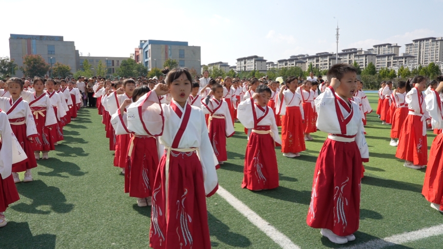 古乐悠扬,孩子们身着汉服,与老师携手穿过“启智门”。一道道稚嫩的身影迈出求知的第一步,象征着他们正式步入知识的殿堂。