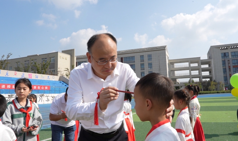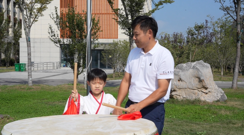 鼓槌起落,“一击鼓敬师长,二击鼓孝父母,三击鼓勤学业”。激昂鼓声中,孩子们树立远大志向,奋勇前行。
