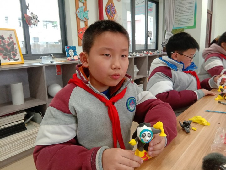 在五年级(1)班,美术老师晁呈玉正在手把手教孩子们使用太空泥制作冰墩墩。晁老师说,冰墩墩作为北京冬奥会吉祥物,冰”象征纯洁、坚强,是冬奥会的特点。“墩墩”则寓意敦厚、敦实、可爱,契合熊猫的整体形象,象征着冬奥会运动员强壮有力的身体、坚韧不拔的意志和鼓舞人心的奥林匹克精神。为了体现这一特点,在制作中,孩子们非常小心,轻揉轻按,注意每一处细节,同时融入自己的创意。大约20分钟,一个个造型奇特、富有想象的冰墩墩造型就呈现在我们眼前了,有滑雪的,有领奖的,还有加油助威的等众多场景。