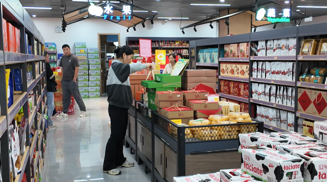 9月29日下午,宿报优选·京东全球购跨境体验店(宿迁馆)内人头攒动。货架上,新鲜的蔬果、储备丰富的米面粮油、各式各样的节日礼盒摆放得井然有序,吸引众多市民前来选购。