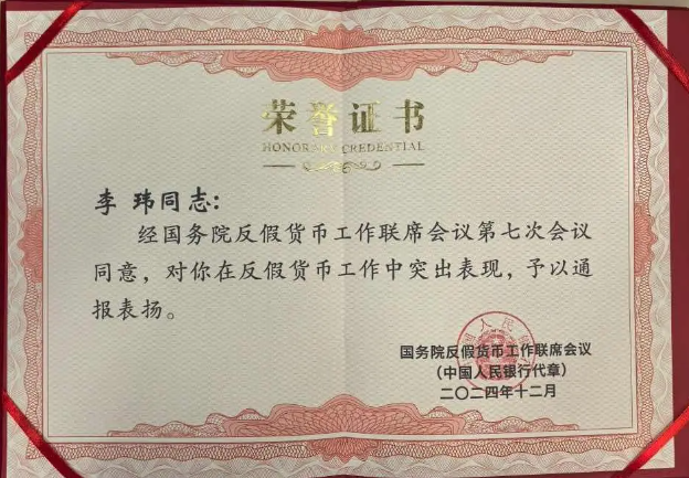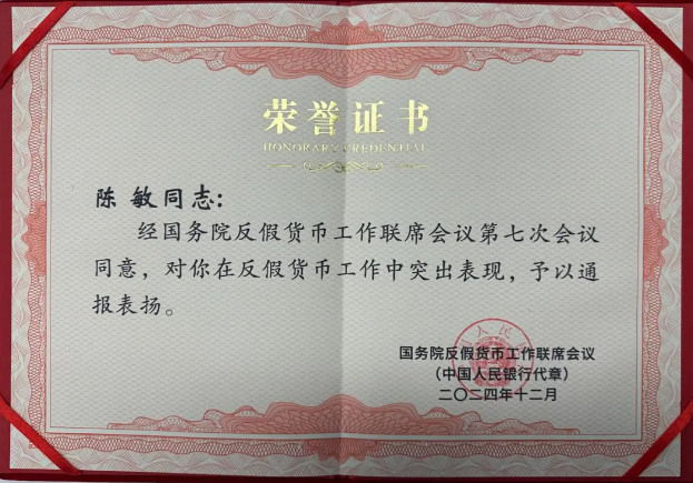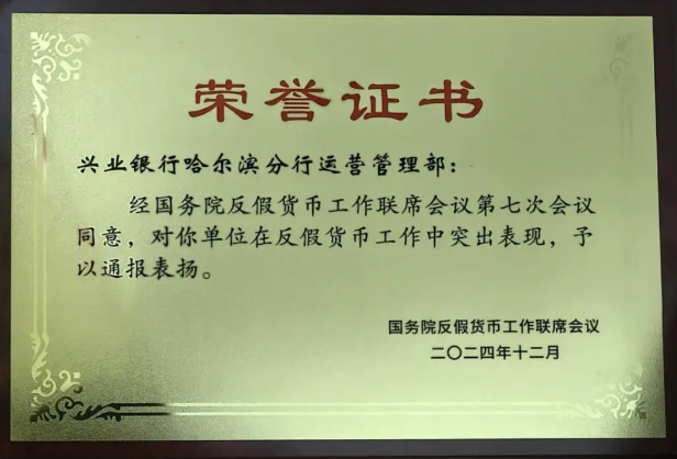 近日,国务院反假货币工作联席会议第七次会议在京召开,会议表扬了2019年以来反假货币工作成绩突出的集体和个人,全国银行业金融机构系统19个集体、35名个人获通报表扬。其中,兴业银行哈尔滨分行运营管理部荣获“反假货币工作成绩突出集体”称号,总行运营管理部、天津分行运营管理部2名同志荣获“反假货币工作成绩突出个人”称号。