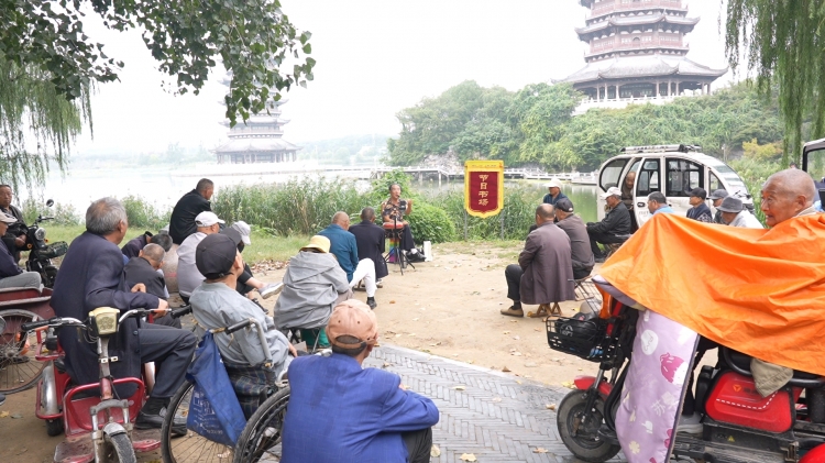 10月1日下午,印象黄河景区双塔公园内传来阵阵鼓声和铜板声,双塔书场惠民演出正在进行,苏北大鼓项目国家级非遗代表性传承人牛崇祥正为大家演绎《十八国走马春秋》。只见他左手执月牙板,右手敲击小圆鼓,动作舒展,说唱结合。台下观众被婉转悠扬的唱腔深深吸引,听得入神。