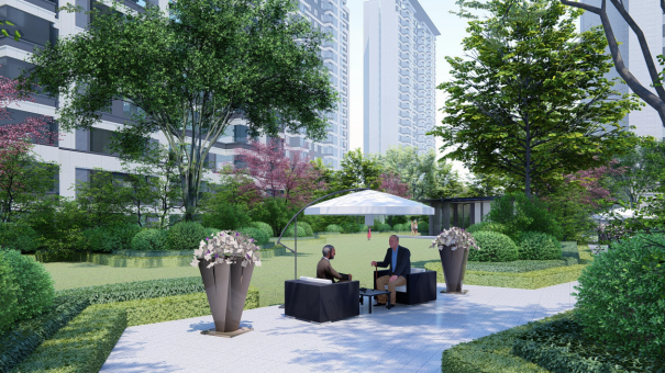 ·景观会客厅:配备静谧卡座、智能化音控设备等,于绿树林荫间坐看自然美景,品茗对弈,闲话家常;
