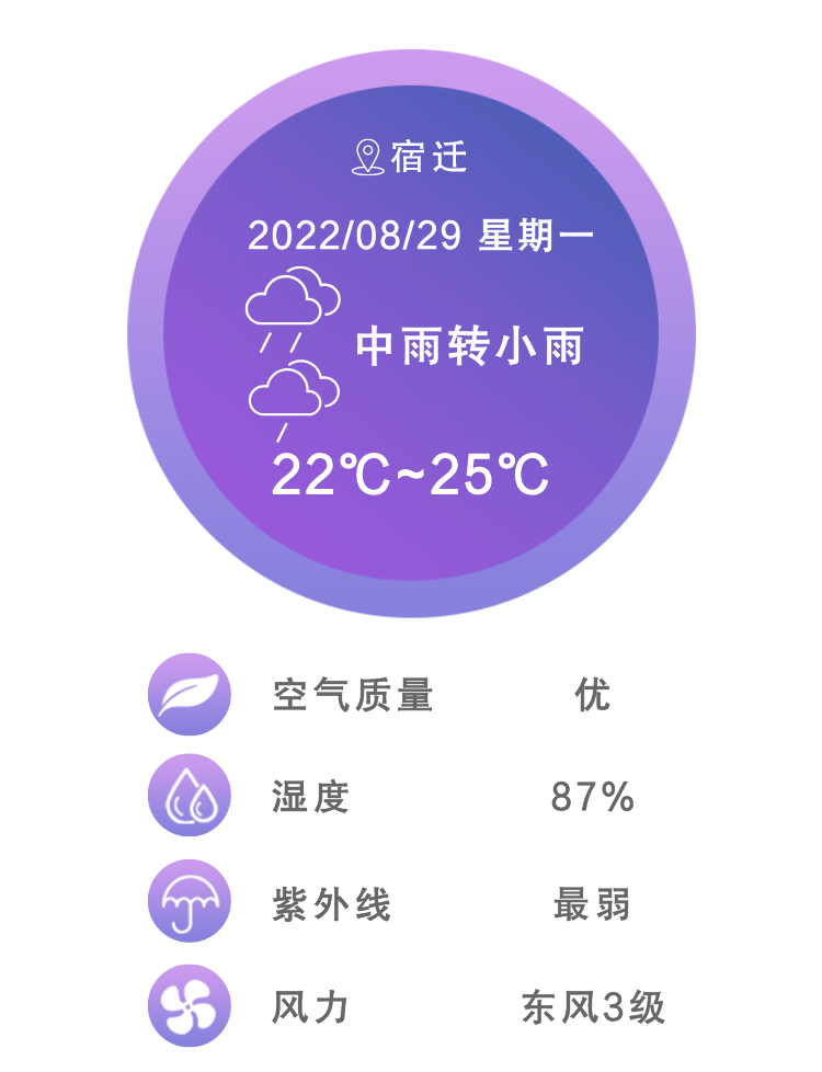 今天是8月28日农历八月初二,星期天。明天是中雨转小雨的天气,最低气温22℃,最高气温25℃,空气质量优,湿度87%,紫外线最弱,东风3级。