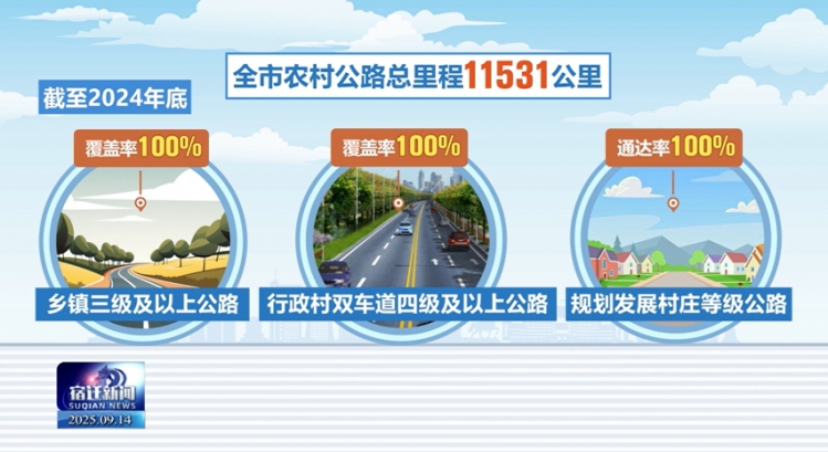 外通内联、安全便捷的农村公路为宿迁乡村的旅游、产业、物流等发展带来机遇,促进农村农业农民得到更多实惠,铺就了乡村振兴的“幸福大道”。“十四五”以来,全市投入31亿元新改建农村公路803公里,投入6.2亿元,完成农村公路改造桥梁159座和安防设施精细化提升工程5156公里。截至2024年底,全市农村公路总里程11531公里,乡镇三级及以上公路覆盖率100%,行政村双车道四级及以上公路覆盖率100%,规划发展村庄等级公路通达率100%,全市已实现城市公交、城乡公交、镇村公交三级客运无缝衔接,村民“抬脚上车”的愿望,已经成为触手可及的现实。