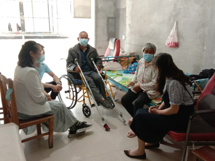 在仓集片区六里棚村,57岁的胡继训一见志愿者来看望他家就特别高兴,因为肢体二级残疾,他只能依靠轮椅和拐杖行走。去年,民政部门为他赠送了电动轮椅,为了帮助他们家打扫卫生,现在每个月六里棚村志愿服务队都上门服务,帮助他们整理家务打扫卫生,和他们谈心,开导他们乐观生活。