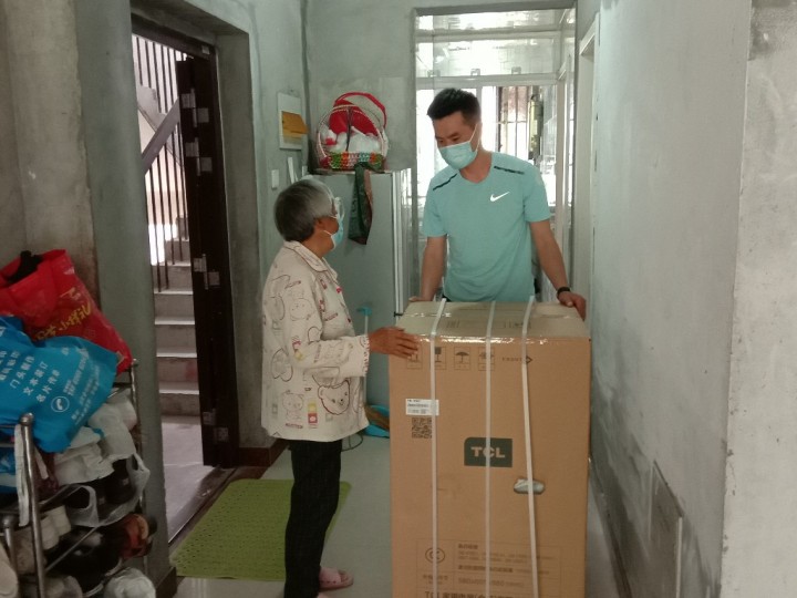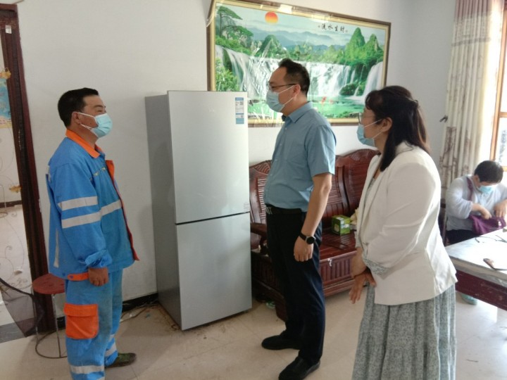 在该小区走访中,社会事业局工作人员还得知环卫工汤崇森的妻子肢体三级残疾,只能在家做些简单家务活,同时照顾两岁多的儿子。由于该户属于低保边缘家庭,经过审核同意,考虑到家庭实际需求,工作人员给他们家送来一台电冰箱。