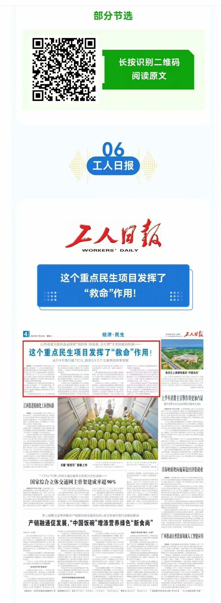 山西创新推出的“预担保、先抢救、后付费”无差别急救模式,在全国已形成可复制、可推广的道交管理范式。这些年,中国人寿财险积极参与山西、山东、陕西、浙江等省份的道交救助基金服务工作,目前已累计垫付资金14.6亿元,追偿7.45亿元,追偿28243起,救助36463人。
