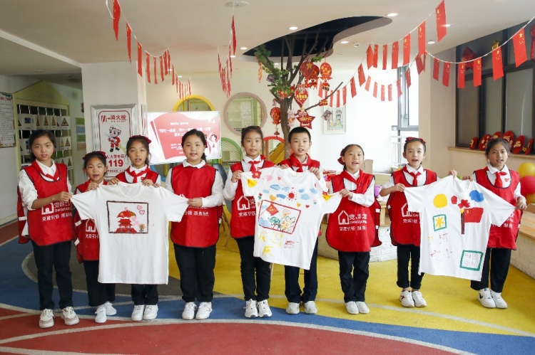 早上九点,随着《我和我的祖国》一首赞歌唱响,国庆庆祝活动正式开始。孩子们在志愿者老师的带领下,走进乡村复兴少年宫。墨斗、算盘、油灯,一个个老物件吸引孩子们的目光,志愿者老师们也是耐心地给孩子们讲解这些老物件背后的故事。此外,科普展示、书法绘画也让孩子们很感兴趣。不少孩子拿起画笔,以“国庆”为主题,在白色T恤上彩绘作画,祝福祖国。
