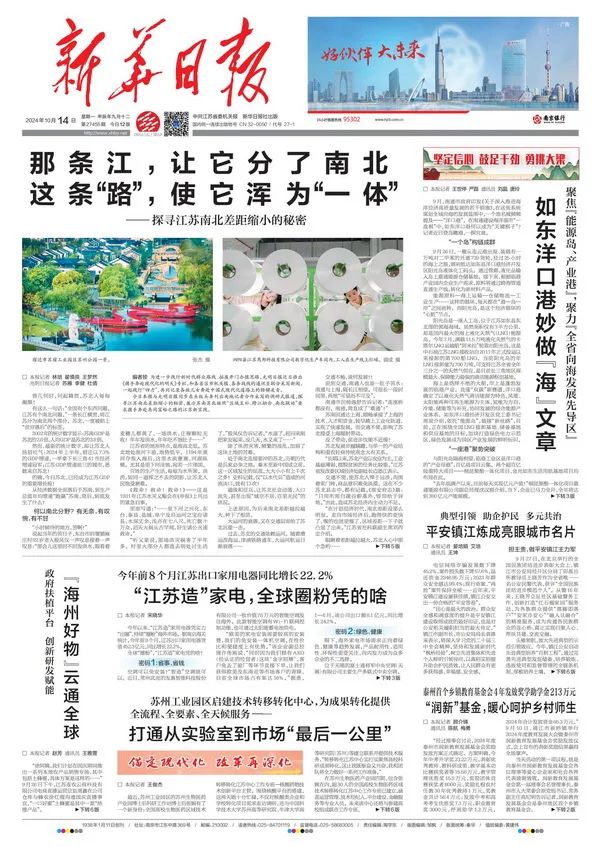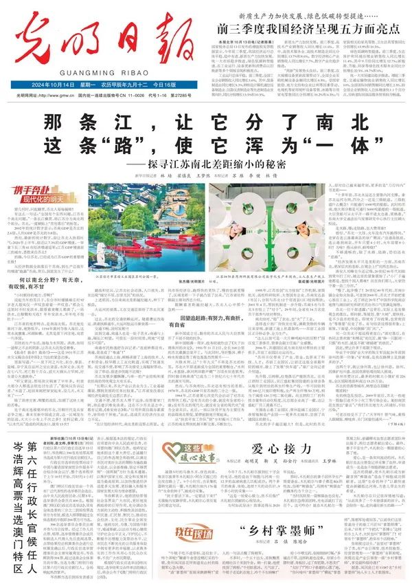 10月14日,《光明日报》与《新华日报》同步在头版头条刊出央地记者合作采写的调研式报道《那条江,让它分了南北 这条“路”,使它浑为“一体”——探寻江苏南北差距缩小的秘密》,以园区图片和开发历程代表性地展示了江苏省区域互补、跨江融合、南北联动的生动剪影。