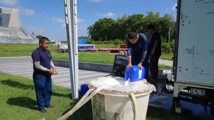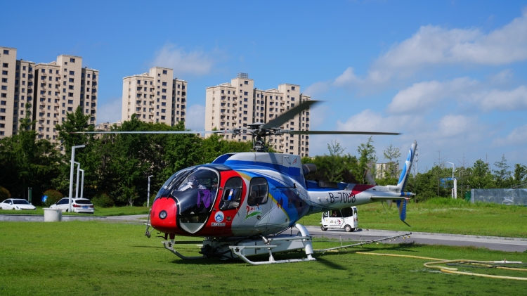 在市洋河新区爱情主题公园一处草坪上,一架8米长,红蓝白三色相间的直升机,在机组人员的引导下稳稳降落。随着机长发出指令,用来消灭美国白蛾等害虫的白色药剂通过专用管道快速注入到飞机药仓内。据了解,本次飞防总面积达4.8万亩。