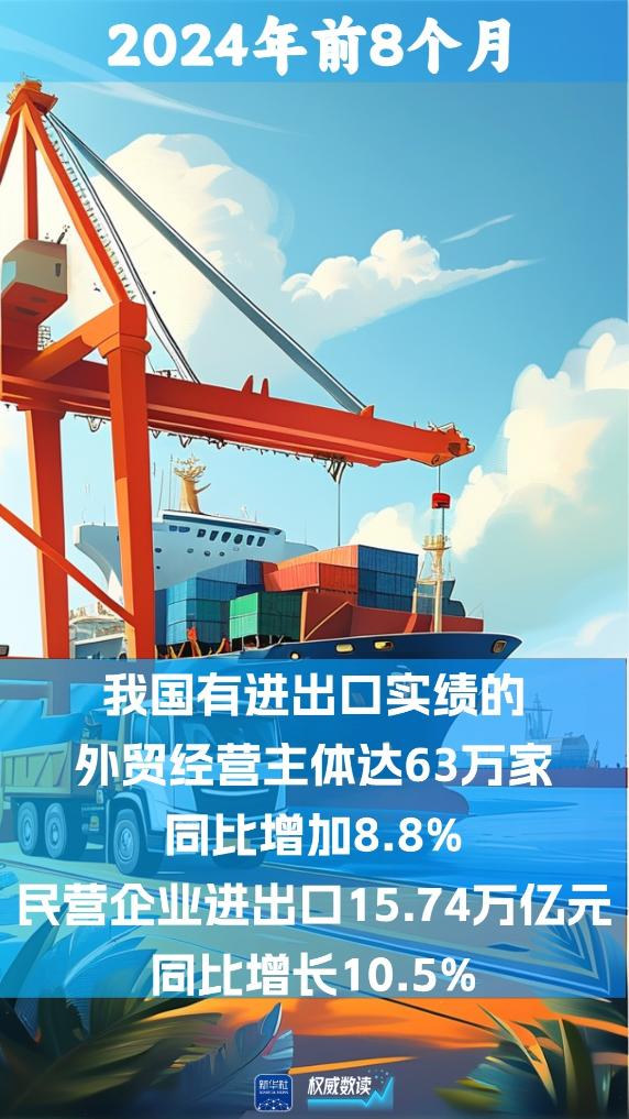 我国外贸经营主体持续活跃,前8个月有进出口实绩的外贸经营主体达63万家,同比增加8.8%。其中,外贸主力军民营企业进出口15.74万亿元。
