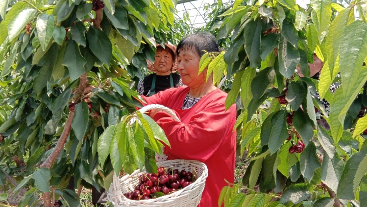 走进果园,一棵棵樱桃树硕果累累,紫红的樱桃挂满枝头,晶莹剔透。工人们三五成群忙着采摘,很快就摘满一篮。