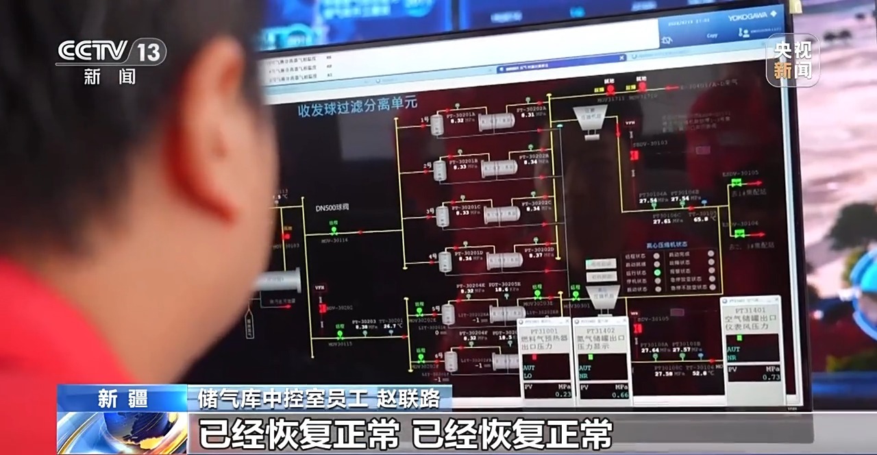 新疆油田储气库有限公司集注站副站长 许鹏:我们储气库投产初期,生产数据采集与存储功能还不完善,员工需要每两小时进行一次巡检,记录我们的生产运行参数。现在运用物联网及人工智能技术以后,员工在生产指挥中心通过工控系统就可以对生产数据进行集中统一监测及远程调控。