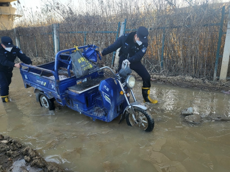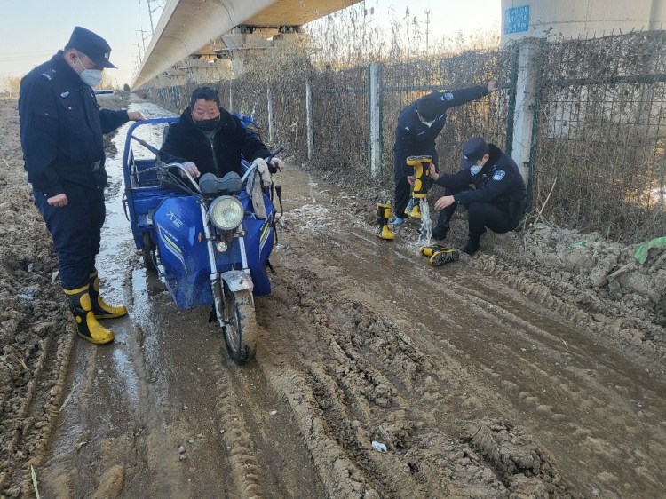 在郑楼居委会郑南组高铁桥洞旁,只见一位老人站在冰冻的路边,浑身颤抖,裤腿已经湿透,燃油三轮车陷在泥泞里无法动弹,孩子的小脸也被冻得通红。见此情况,民警黄秀东和队友急忙抱起孩子,搀扶老人走到有阳光的地方,临时暖暖身子,然后过去推车。由于车轮陷入太深,最深处足有四五十公分,三名队员只能用尽全力你推我拽,最终将车子拉了上来。
