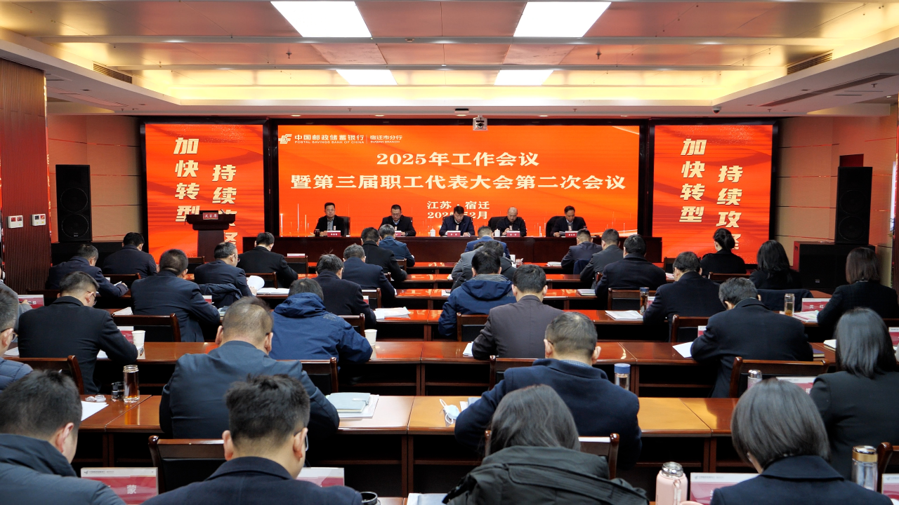 2月13日,邮储银行宿迁市分行组织召开2025年工作会议暨第三届职工代表大会第二次会议。会议总结回顾2024年主要工作,研究部署2025年重点工作。邮储银行江苏省分行党委委员孙成作重要讲话,邮储银行宿迁市分行党委书记、行长夏红青作大会工作报告。