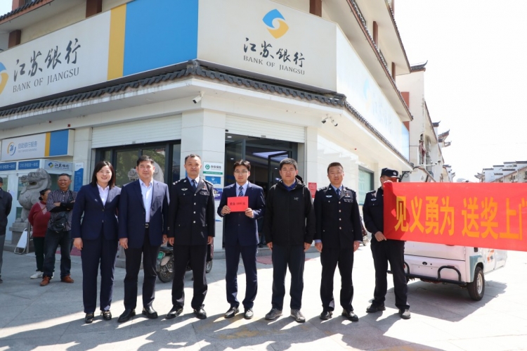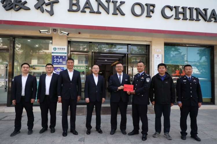 为积极营造全民反诈的浓厚氛围,4月29日上午,分局洋河派出所所长徐立永代表市见义勇为基金会,带队专程去往辖区江苏银行、中国银行,对积极参与反诈劝阻的二名银行职员进行奖励。“见义勇为 送奖上门”派出所工作人员拉着横幅,伴随着辖区自发而来的锣鼓队,现场气氛浓郁。